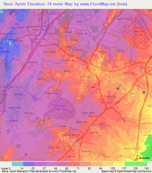 Below is the Elevation map of Bene 'Ayish,Israel, which displays range of elevation with different colours.