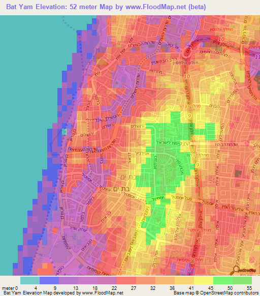 Below is the Elevation map of Bat Yam,Israel, which displays range of elevation with different colours.