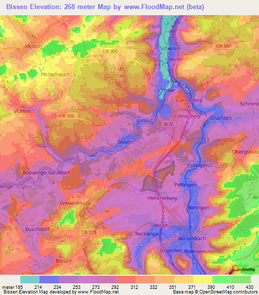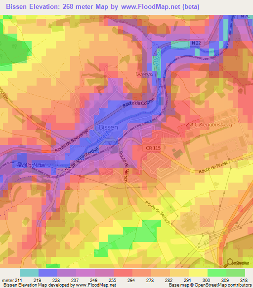 Below is the Elevation map of Bissen,Luxembourg, which displays range of elevation with different colours.