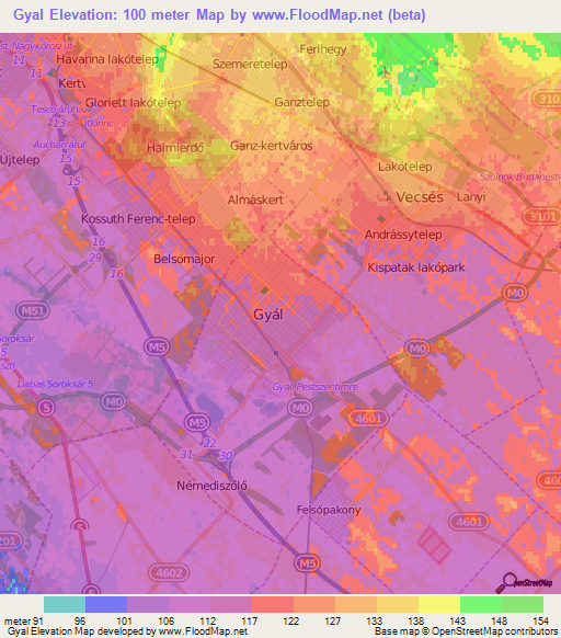 Below is the Elevation map of Gyal,Hungary, which displays range of elevation with different colours.