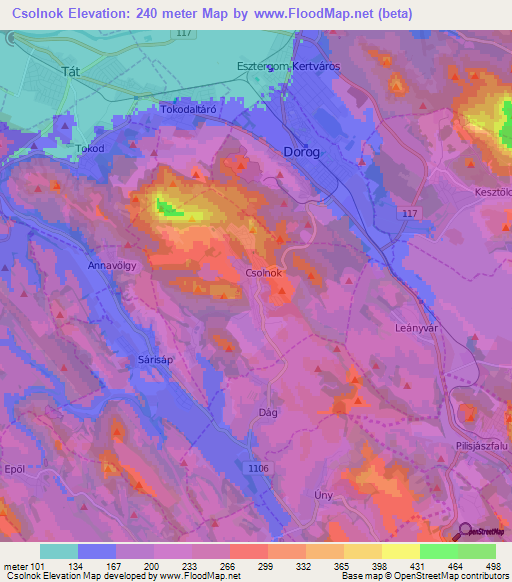 Below is the Elevation map of Csolnok,Hungary, which displays range of elevation with different colours.