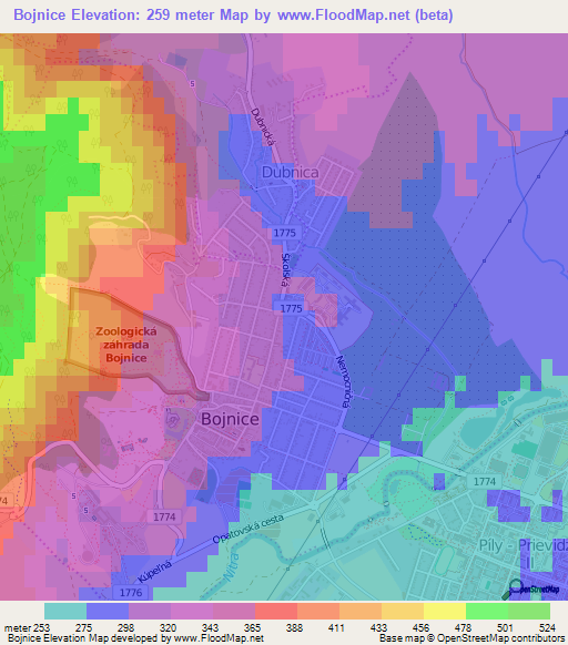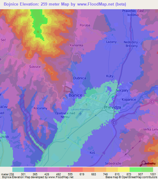 Below is the Elevation map of Bojnice,Slovakia, which displays range of elevation with different colours.