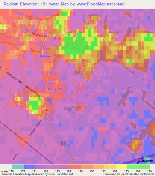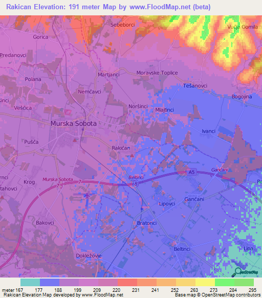 Below is the Elevation map of Rakican,Slovenia, which displays range of elevation with different colours.