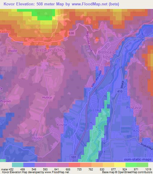 Kovor,Slovenia Elevation Map is displayed at different zoom levels.