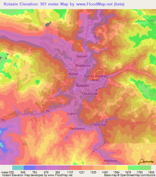 Below is the Elevation map of Kolasin,Montenegro, which displays range of elevation with different colours.