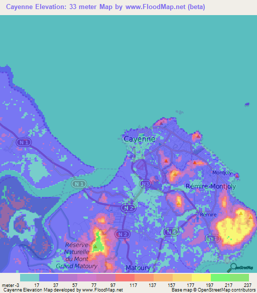 Note:Please note that Cayenne,French Guiana Elevation Map is in beta.