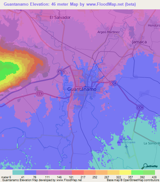 Note:Please note that Guantanamo,Cuba Elevation Map is in beta.