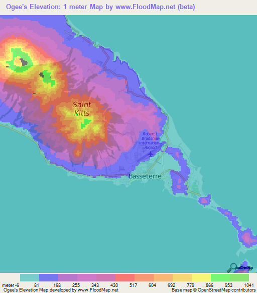 The elevation map of Ogee's,Saint Kitts and Nevis is generated using elevation data from NASA's 90m resolution SRTM data.