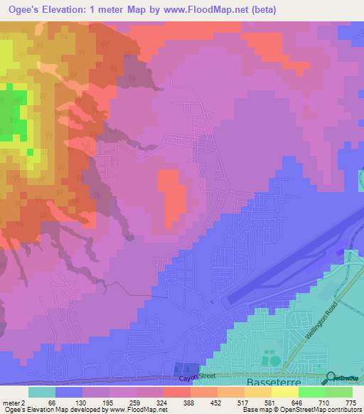 Below is the Elevation map of Ogee's,Saint Kitts and Nevis, which displays range of elevation with different colours.