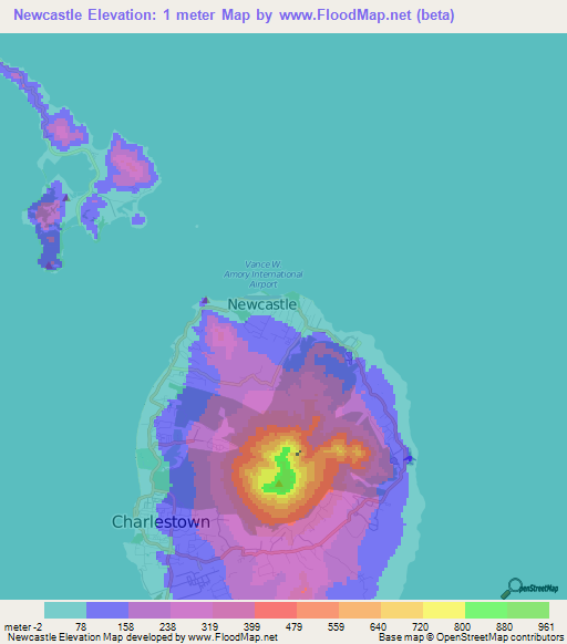 Below is the Elevation map of Newcastle,Saint Kitts and Nevis, which displays range of elevation with different colours.