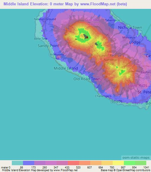 Middle Island,Saint Kitts and Nevis Elevation Map is displayed at different zoom levels.