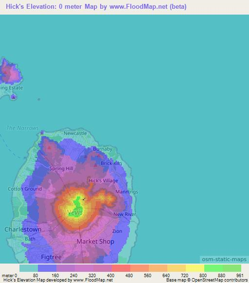Hick's,Saint Kitts and Nevis Elevation Map is displayed at different zoom levels.