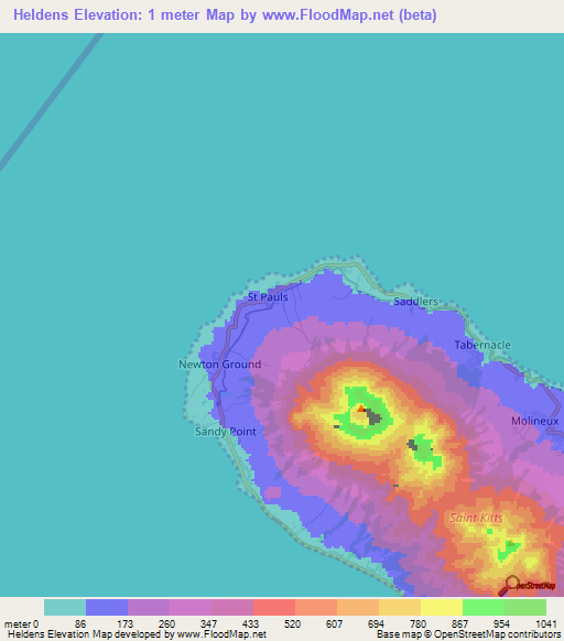 Note:Please note that Heldens,Saint Kitts and Nevis Elevation Map is in beta.