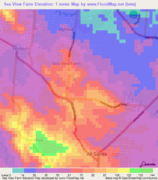 Below is the Elevation map of Sea View Farm,Antigua and Barbuda, which displays range of elevation with different colours.