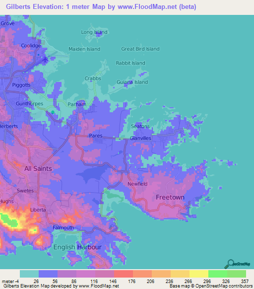 Note:Please note that Gilberts,Antigua and Barbuda Elevation Map is in beta.