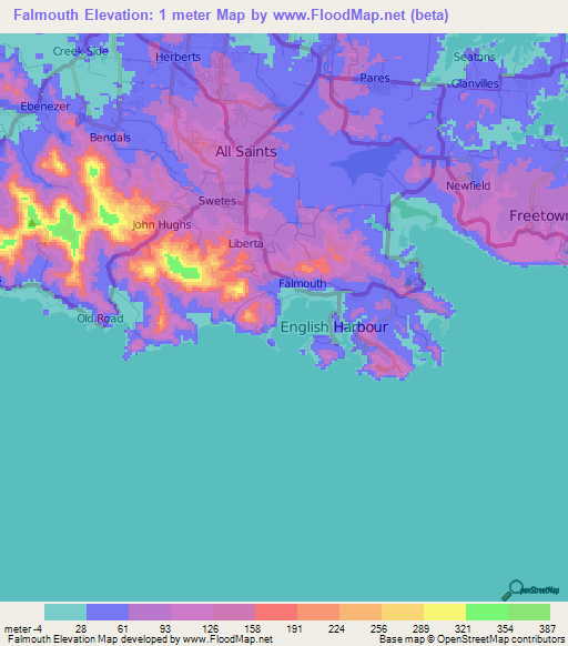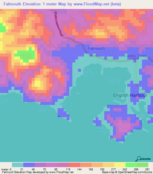 Note:Please note that Falmouth,Antigua and Barbuda Elevation Map is in beta.