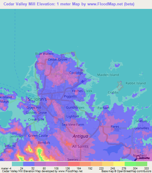 Note:Please note that Cedar Valley Mill,Antigua and Barbuda Elevation Map is in beta.
