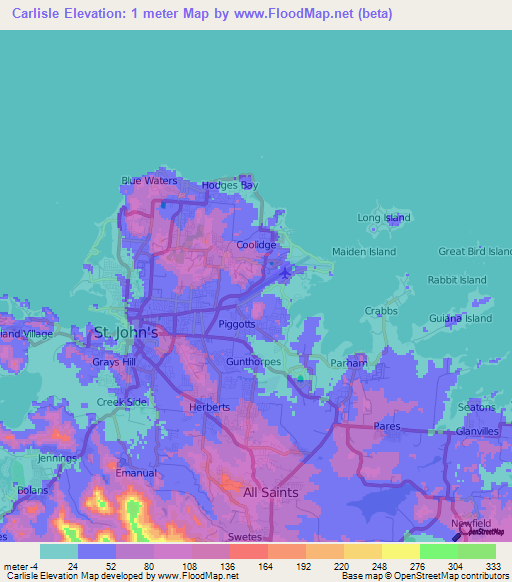 Below is the Elevation map of Carlisle,Antigua and Barbuda, which displays range of elevation with different colours.