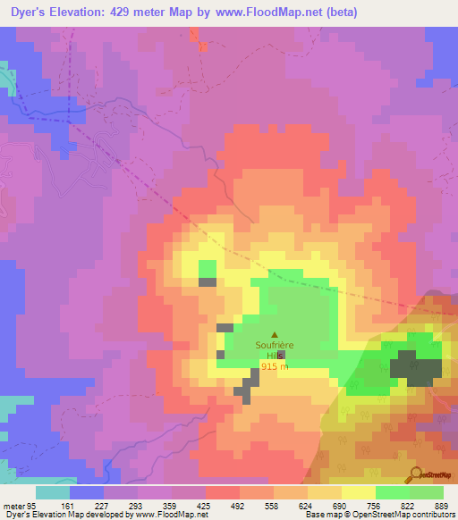 Below is the Elevation map of Dyer's,Montserrat, which displays range of elevation with different colours.