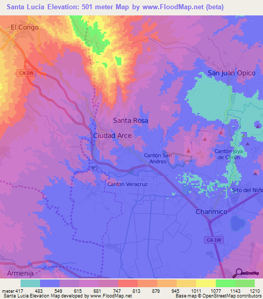 Note:Please note that Santa Lucia,El Salvador Elevation Map is in beta.