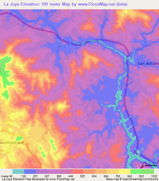 Below is the Elevation map of La Joya,El Salvador, which displays range of elevation with different colours.