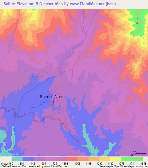 Below is the Elevation map of Salitre,Costa Rica, which displays range of elevation with different colours.
