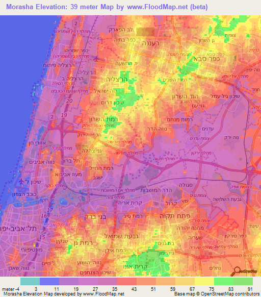 Below is the Elevation map of Morasha,Israel, which displays range of elevation with different colours.