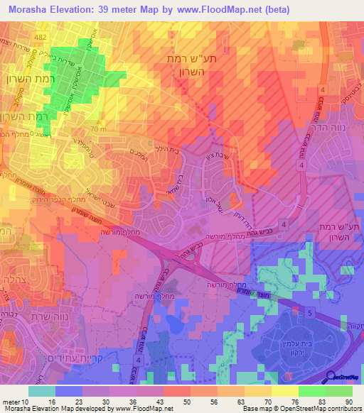 The elevation map of Morasha,Israel is generated using elevation data from NASA's 90m resolution SRTM data.
