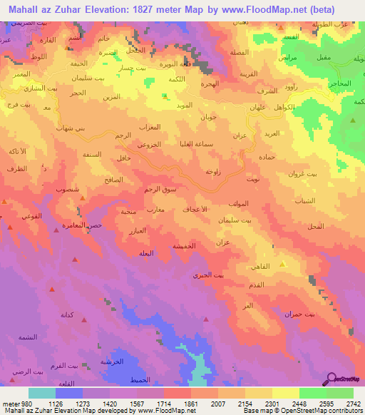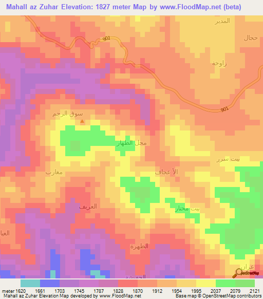 Below is the Elevation map of Mahall az Zuhar,Yemen, which displays range of elevation with different colours.