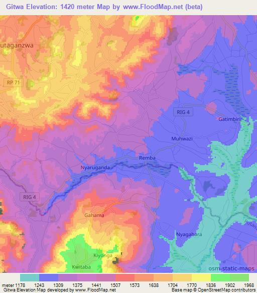 Gitwa,Burundi Elevation Map is displayed at different zoom levels.