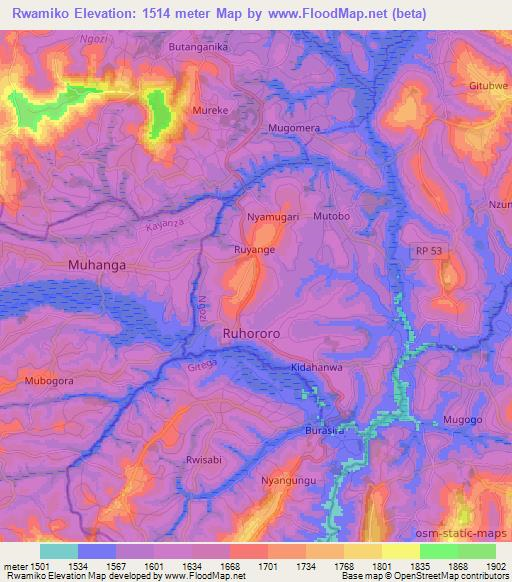 Rwamiko,Burundi Elevation Map is displayed at different zoom levels.