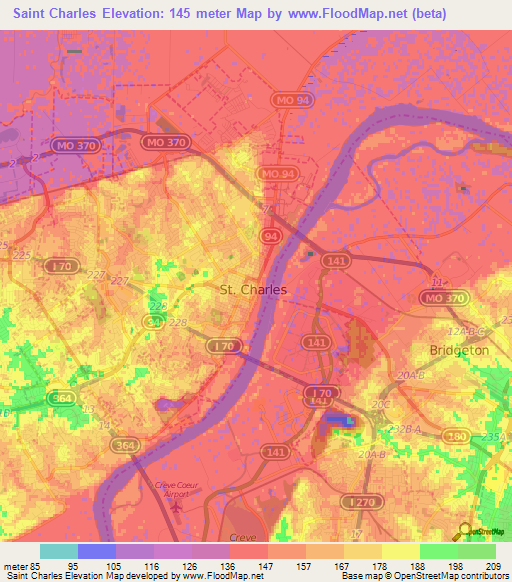Below is the Elevation map of Saint Charles,US, which displays range of elevation with different colours.