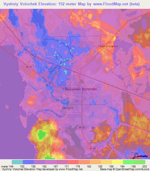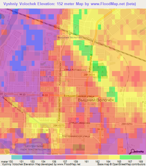 Below is the Elevation map of Vyshniy Volochek,Russia, which displays range of elevation with different colours.