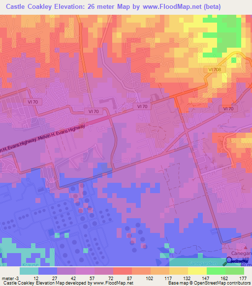 Below is the Elevation map of Castle Coakley,U.S. Virgin Islands, which displays range of elevation with different colours.