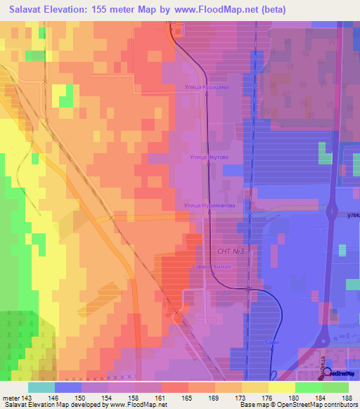 Below is the Elevation map of Salavat,Russia, which displays range of elevation with different colours.