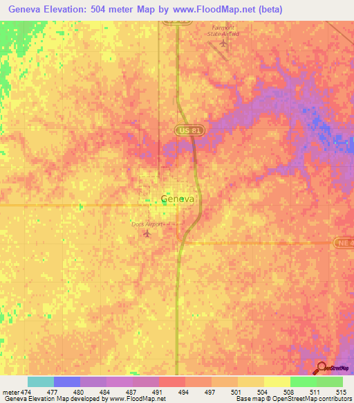 Below is the Elevation map of Geneva,US, which displays range of elevation with different colours.