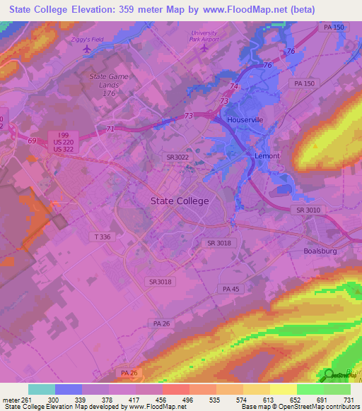 Below is the Elevation map of State College,US, which displays range of elevation with different colours.