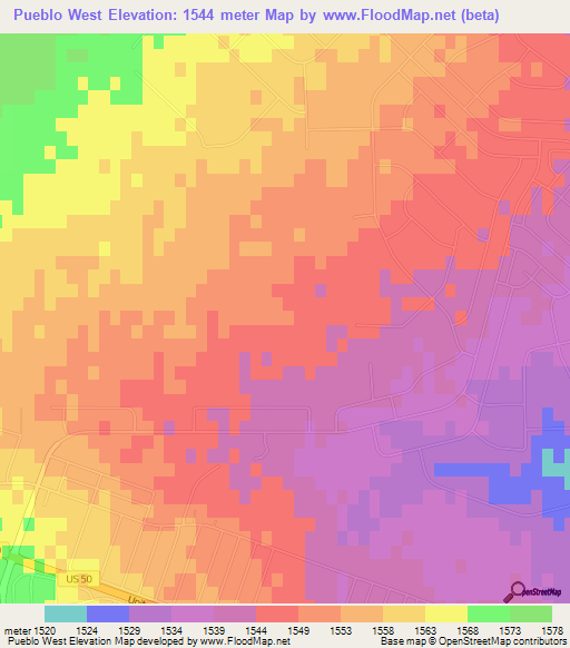 Below is the Elevation map of Pueblo West,US, which displays range of elevation with different colours.
