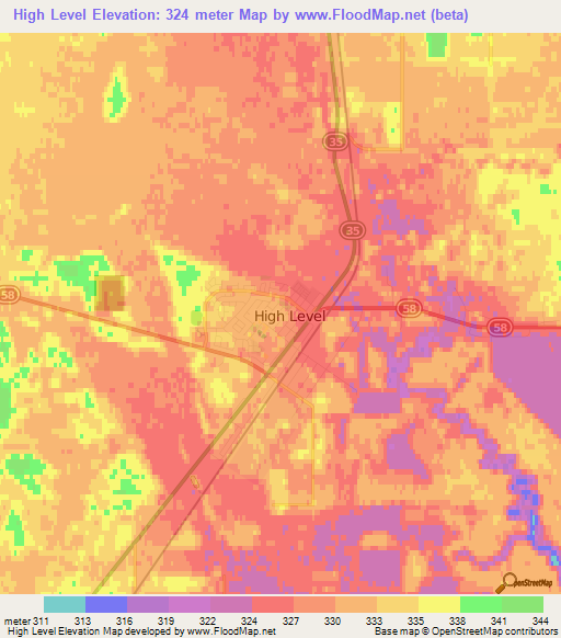 Below is the Elevation map of High Level,Canada, which displays range of elevation with different colours.