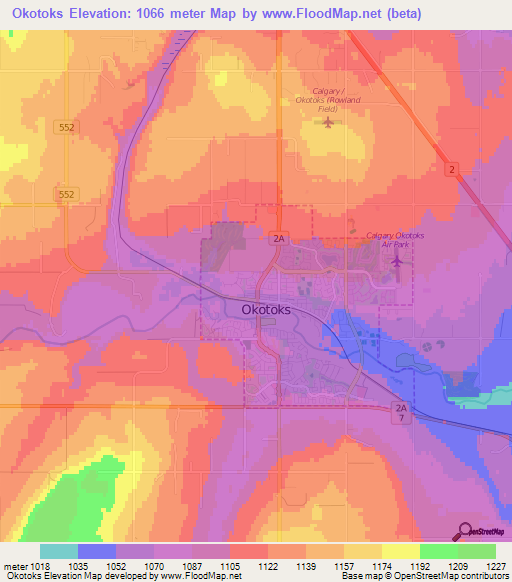 Below is the Elevation map of Okotoks,Canada, which displays range of elevation with different colours.