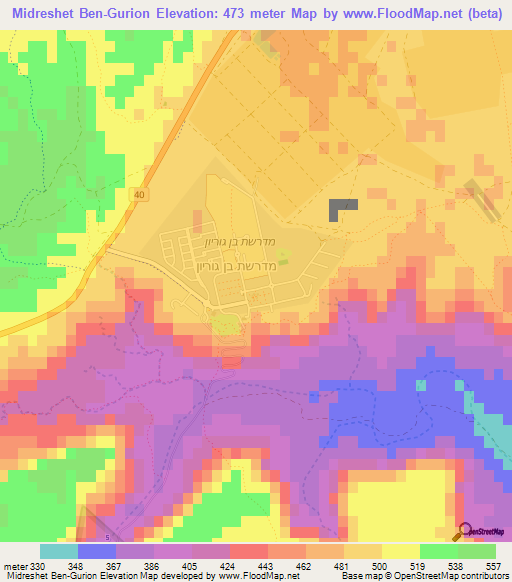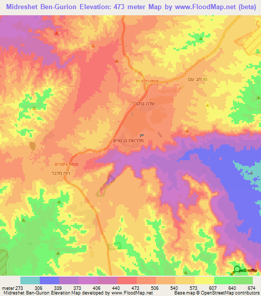 Below is the Elevation map of Midreshet Ben-Gurion,Israel, which displays range of elevation with different colours.
