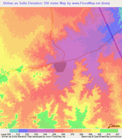 Below is the Elevation map of Shihan as Sufla,Yemen, which displays range of elevation with different colours.