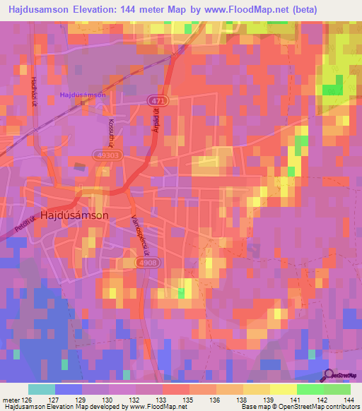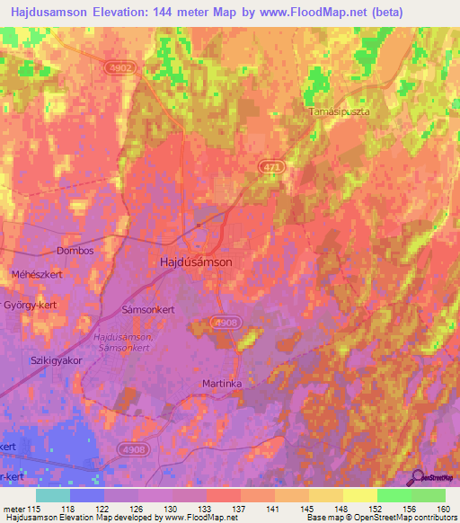 Below is the Elevation map of Hajdusamson,Hungary, which displays range of elevation with different colours.