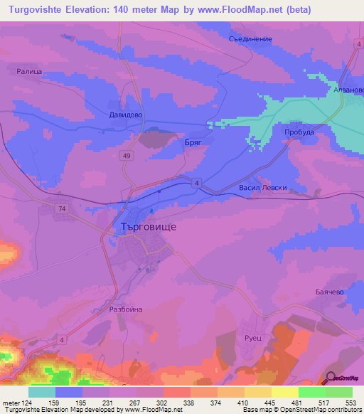 Below is the Elevation map of Turgovishte,Bulgaria, which displays range of elevation with different colours.