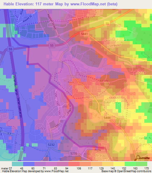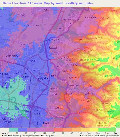 Below is the Elevation map of Hable,Israel, which displays range of elevation with different colours.