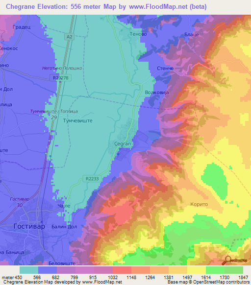 Below is the Elevation map of Chegrane,Macedonia, which displays range of elevation with different colours.