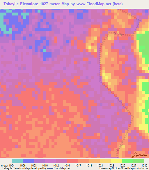Below is the Elevation map of Tshayile,Zimbabwe, which displays range of elevation with different colours.
