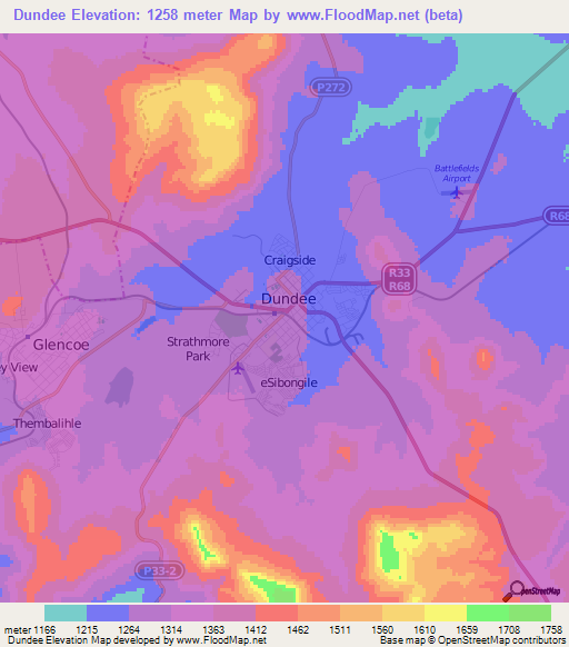 Below is the Elevation map of Dundee,South Africa, which displays range of elevation with different colours.