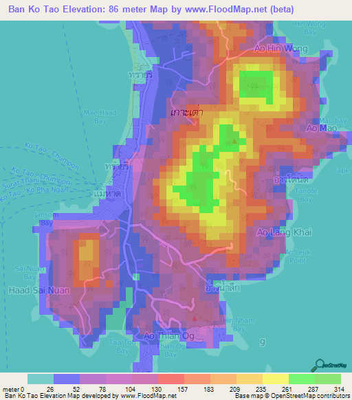 Below is the Elevation map of Ban Ko Tao,Thailand, which displays range of elevation with different colours.