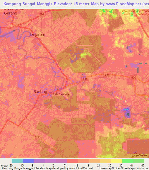 Below is the Elevation map of Kampung Sungai Manggis,Malaysia, which displays range of elevation with different colours.